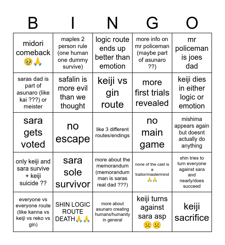 This bingo card has a free space and 24 words: sara sole survivor, SHIN LOGIC ROUTE DEATH🙏🙏, keiji vs gin route, everyone vs everyone route (like kanna vs keiji vs reko vs gin), mr policeman is joes dad, midori comeback🥹🙏, saras dad is part of asunaro (like kai ???) or meister, maples 2 person rule (one human one dummy survive), no main game, more about the memorandum (memorandum man is saras real dad ???), more first trials revealed, sara gets voted, none of the cast is a traitor/mastermind🙏🙏, shin tries to turn everyone against sara and nearly/does succeed, safalin is more evil than we thought, keiji turns against sara asp☹️☹️, mishima appears again but doesnt actually do anything, logic route ends up better than emotion, keiji dies in either logic or emotion, no escape, keiji sacrifice, only keiji and sara survive + keiji suicide ??, more info on mr policeman (maybe part of asunaro ??) and more about asunaro creating humans/humanity in general.