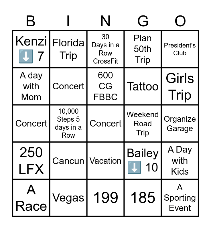 This bingo card has 25 words: Cancun, 199, 600 CG FBBC, A Race, President's Club, Kenzi ⬇️ 7, A day with Mom, Florida Trip, Weekend Road Trip, Vacation, Tattoo, Concert, Bailey ⬇️ 10, A Day with Kids, Concert, A Sporting Event, Organize Garage, 30 Days in a Row CrossFit, Girls Trip, 10,000 Steps 5 days in a Row, Concert, Vegas, 250 LFX, Plan 50th Trip and 185.
