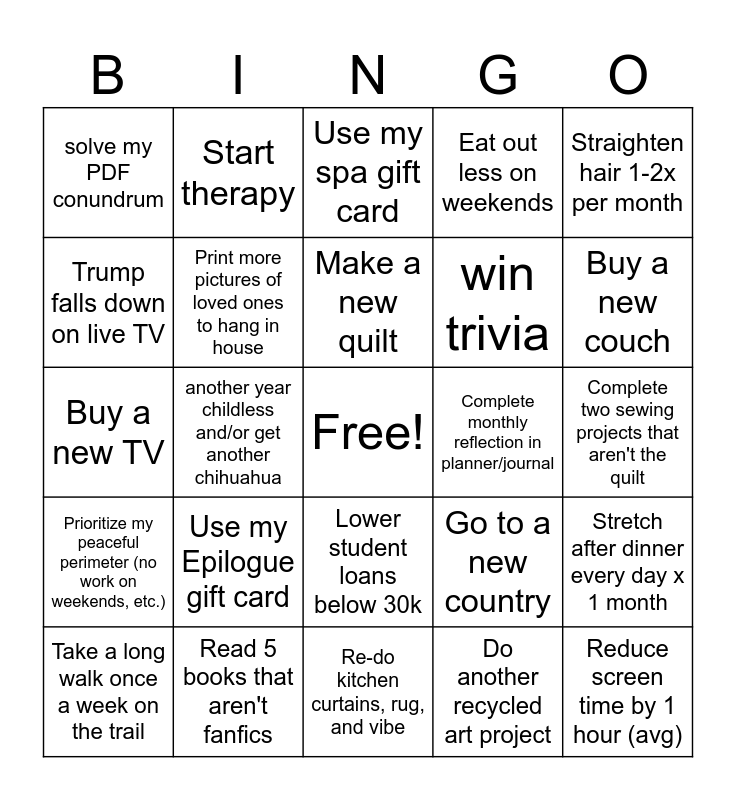 This bingo card has a free space and 24 words: Use my Epilogue gift card, Read 5 books that aren't fanfics, Make a new quilt, Take a long walk once a week on the trail, Straighten hair 1-2x per month, solve my PDF conundrum, Trump falls down on live TV, Start therapy, Complete monthly reflection in planner/journal, Lower student loans below 30k, win trivia, Buy a new TV, Go to a new country, Stretch after dinner every day x 1 month, Print more pictures of loved ones to hang in house, Do another recycled art project, Complete two sewing projects that aren't the quilt, Use my spa gift card, Buy a new couch, another year childless and/or get another chihuahua, Reduce screen time by 1 hour (avg), Prioritize my peaceful perimeter (no work on weekends, etc.), Eat out less on weekends and Re-do kitchen curtains, rug, and vibe.