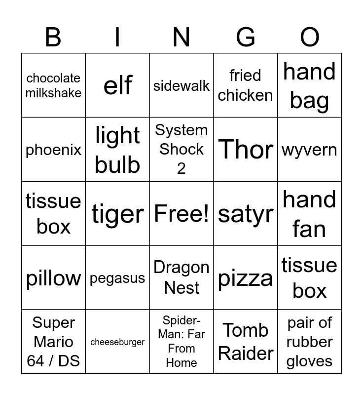 This bingo card has a free space and 25 words: pegasus, Spider-Man: Far From Home, System Shock 2, Super Mario 64 / DS, hand bag, chocolate milkshake, phoenix, elf, satyr, Dragon Nest, Thor, tissue box, pizza, tissue box, light bulb, fish, hand fan, sidewalk, wyvern, tiger, pair of rubber gloves, cheeseburger, pillow, fried chicken and Tomb Raider.