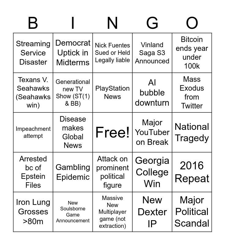 This bingo card has a free space and 24 words: Gambling Epidemic, New Soulsborne Game Announcement, PlayStation News, Iron Lung Grosses >80m, Bitcoin ends year under 100k, Streaming Service Disaster, Texans V. Seahawks (Seahawks win), Democrat Uptick in Midterms, Major YouTuber on Break, Attack on prominent political figure, AI bubble downturn, Impeachment attempt, Georgia College Win, 2016 Repeat, Generational new TV Show (ST(1) & BB), New Dexter IP, National Tragedy, Nick Fuentes Sued or Held Legally liable, Mass Exodus from Twitter, Disease makes Global News, Major Political Scandal, Arrested bc of Epstein Files, Vinland Saga S3 Announced and Massive New Multiplayer game (not extraction).