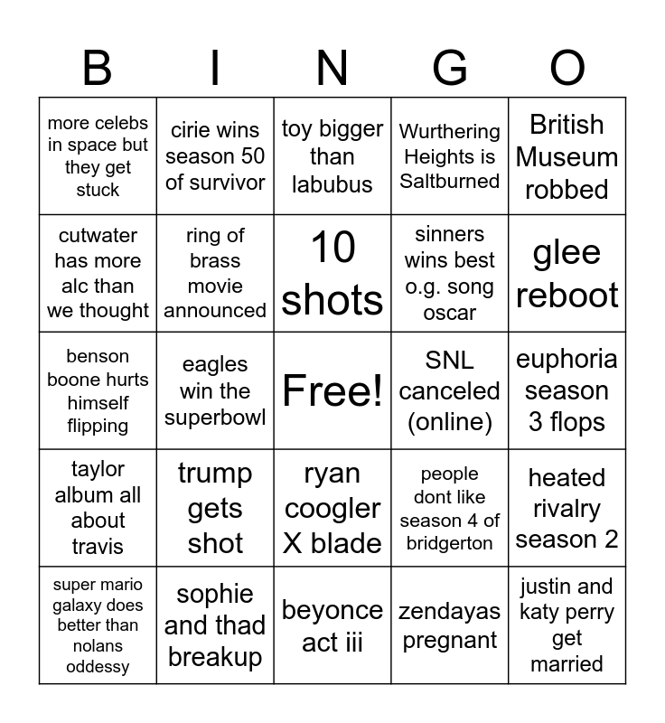 This bingo card has a free space and 24 words: trump gets shot, sophie and thad breakup, 10 shots, super mario galaxy does better than nolans oddessy, British Museum robbed, more celebs in space but they get stuck, cutwater has more alc than we thought, cirie wins season 50 of survivor, SNL canceled (online), ryan coogler X blade, sinners wins best o.g. song oscar, benson boone hurts himself flipping, people dont like season 4 of bridgerton, heated rivalry season 2, ring of brass movie announced, zendayas pregnant, euphoria season 3 flops, toy bigger than labubus, glee reboot, eagles win the superbowl, justin and katy perry get married, taylor album all about travis, Wurthering Heights is Saltburned and beyonce act iii.