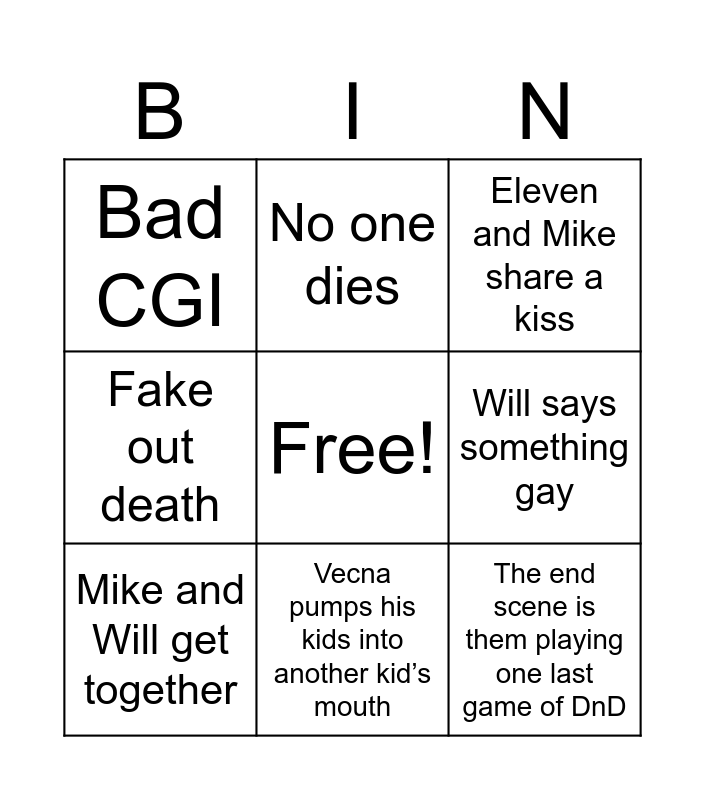 This bingo card has a free space and 8 words: Will says something gay, Eleven and Mike share a kiss, No one dies, Mike and Will get together, Bad CGI, The end scene is them playing one last game of DnD, Fake out death and Vecna pumps his kids into another kid’s mouth.