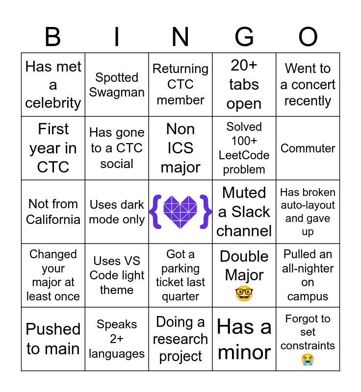 This bingo card has a free space and 24 words: Uses VS Code light theme, Speaks 2+ languages, Non ICS major, Pushed to main, Went to a concert recently, Has met a celebrity, First year in CTC, Spotted Swagman, Muted a Slack channel, Got a parking ticket last quarter, Solved 100+ LeetCode problem, Not from California, Double Major 🤓, Pulled an all-nighter on campus, Has gone to a CTC social, Has a minor, Has broken auto-layout and gave up, Returning CTC member, Commuter, Uses dark mode only, Forgot to set constraints 😭, Changed your major at least once, 20+ tabs open and Doing a research project.