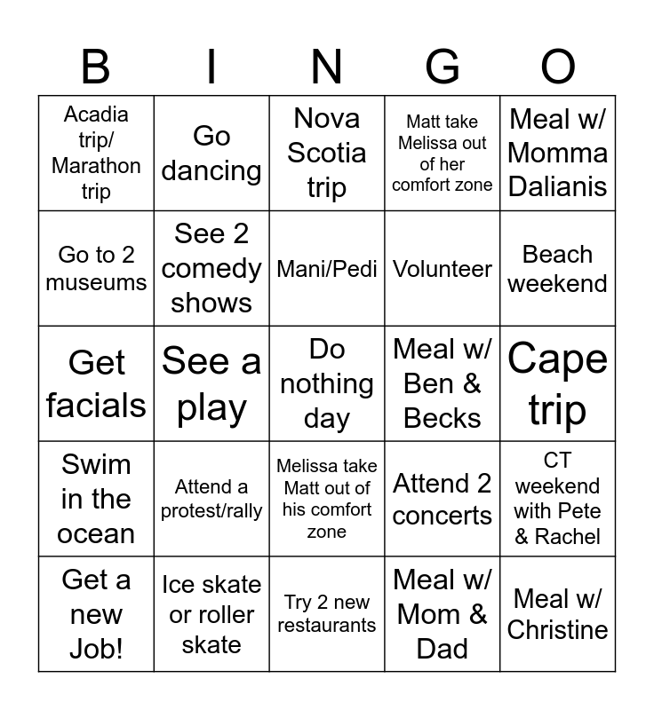 This bingo card has a free space and 24 words: Attend a protest/rally, Ice skate or roller skate, Mani/Pedi, Get a new Job!, Meal w/ Momma Dalianis, Acadia trip/ Marathon trip, Go to 2 museums, Go dancing, Meal w/ Ben & Becks, Melissa take Matt out of his comfort zone, Volunteer, Get facials, Attend 2 concerts, CT weekend with Pete & Rachel, See 2 comedy shows, Meal w/ Mom & Dad, Cape trip, Nova Scotia trip, Beach weekend, See a play, Meal w/ Christine, Swim in the ocean, Matt take Melissa out of her comfort zone and Try 2 new restaurants.