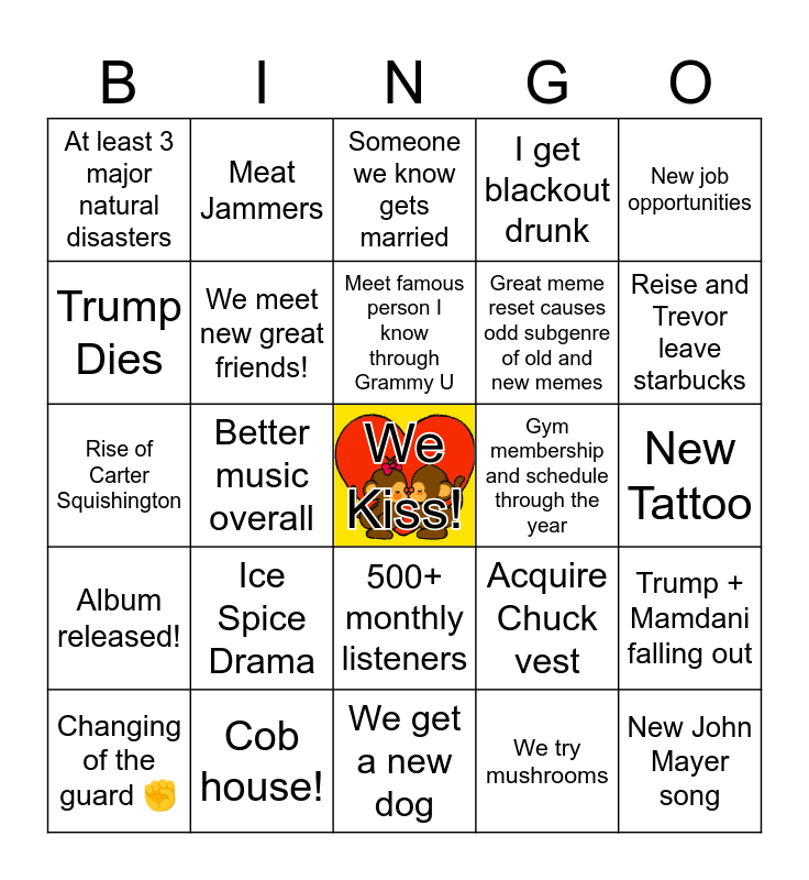 This bingo card has a free space and 24 words: Ice Spice Drama, Cob house!, Meet famous person I know through Grammy U, Changing of the guard ✊️, New job opportunities, At least 3 major natural disasters, Trump Dies, Meat Jammers, Gym membership and schedule through the year, 500+ monthly listeners, Great meme reset causes odd subgenre of old and new memes, Rise of Carter Squishington, Acquire Chuck vest, Trump + Mamdani falling out, We meet new great friends!, We try mushrooms, New Tattoo, Someone we know gets married, Reise and Trevor leave starbucks, Better music overall, New John Mayer song, Album released!, I get blackout drunk and We get a new dog.