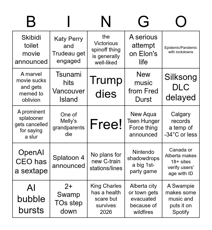 This bingo card has a free space and 24 words: Splatoon 4 announced, 2+ Swamp TOs step down, Trump dies, AI bubble bursts, Epidemic/Pandemic with lockdowns, Skibidi toilet movie announced, A marvel movie sucks and gets memed to oblivion, Katy Perry and Trudeau get engaged, New Aqua Teen Hunger Force thing announced, No plans for new C-train stations/lines, New music from Fred Durst, A prominent splatooner gets cancelled for saying a slur, Nintendo shadowdrops a big 1st- party game, Canada or Alberta makes 18+ sites verify users' age with ID, Tsunami hits Vancouver Island, Alberta city or town gets evacuated because of wildfires, Calgary records a temp of -34°C or less, the Victorious spinoff thing is generally well-liked, Silksong DLC delayed, One of Melly's grandparents die, A Swampie makes some music and puts it on Spotify, OpenAI CEO has a sextape, A serious attempt on Elon's life and King Charles has a health scare but survives 2026.