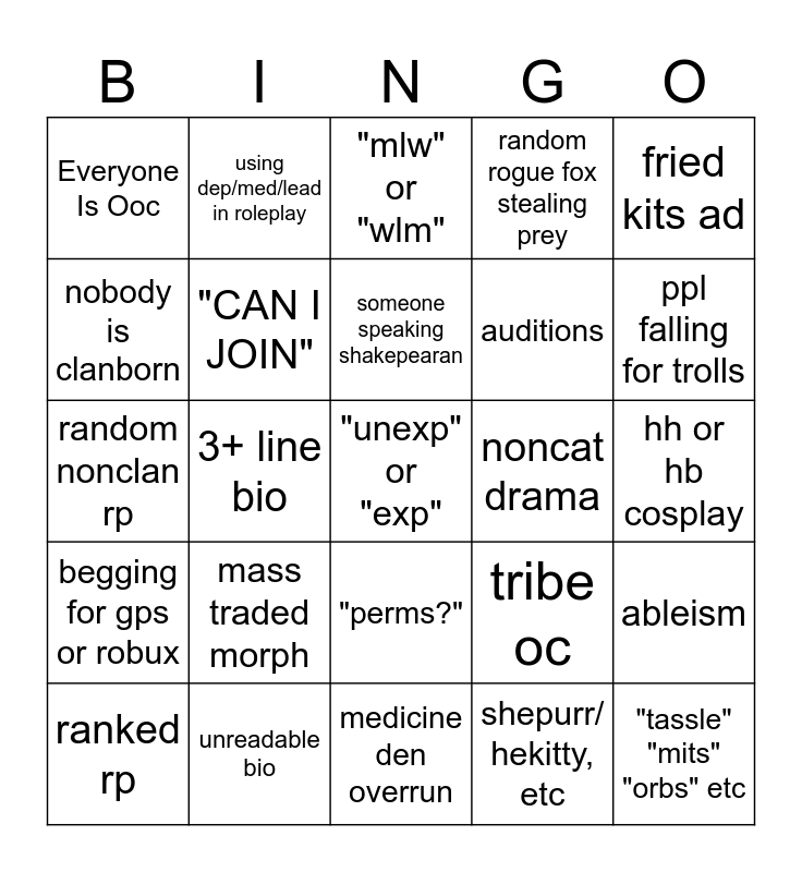 This bingo card has a free space and 24 words: mass traded morph, unreadable bio, someone speaking shakepearan, ranked rp, fried kits ad, Everyone Is Ooc, nobody is clanborn, using dep/med/lead in roleplay, noncat drama, "perms?", auditions, random nonclan rp, tribe oc, ableism, "CAN I JOIN", shepurr/ hekitty, etc, hh or hb cosplay, "mlw" or "wlm", ppl falling for trolls, 3+ line bio, "tassle" "mits" "orbs" etc, begging for gps or robux, random rogue fox stealing prey and medicine den overrun.