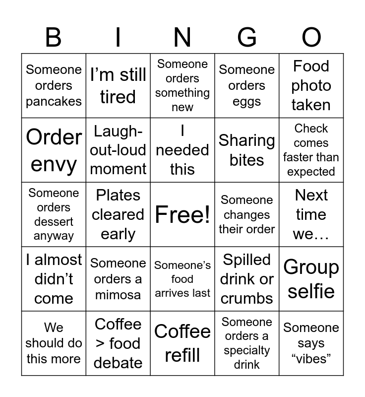 This bingo card has a free space and 25 words: Someone orders a mimosa, Coffee refill, I needed this, We should do this more, Food photo taken, Someone orders pancakes, Order envy, I’m still tired, Someone changes their order, Someone’s food arrives last, Sharing bites, Someone orders dessert anyway, Spilled drink or crumbs, Group selfie, Laugh-out-loud moment, Worth it, Next time we…, Someone orders something new, Check comes faster than expected, Plates cleared early, Someone says “vibes”, Coffee > food debate, I almost didn’t come, Someone orders eggs and Someone orders a specialty drink.