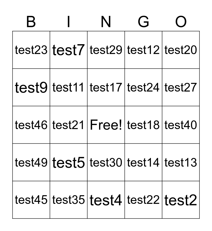 This bingo card has a free space and 50 words: test1, test2, test3, test4, test5, test6, test7, test8, test9, test10, test11, test12, test13, test14, test15, test16, test17, test18, test19, test20, test21, test22, test23, test24, test25, test26, test27, test28, test29, test30, test31, test32, test33, test34, test35, test36, test37, test38, test39, test40, test41, test42, test43, test44, test45, test46, test47, test48, test49 and test50.