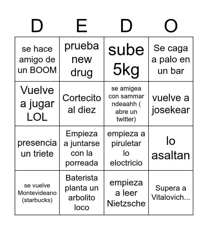 This bingo card has 16 words: Baterista planta un arbolito loco, lo asaltan, sube 5kg, se hace amigo de un BOOM, presencia un triete, prueba new drug, empieza a piruletar lo eloctricio, empieza a leer Nietzsche, Vuelve a jugar LOL, Cortecito al diez, se vuelve Montevideano (starbucks), Se caga a palo en un bar, Empieza a juntarse con la porreada, vuelve a josekear, se amigea con sammar ndeaahh ( abre un twitter) and Supera a Vitalovich....