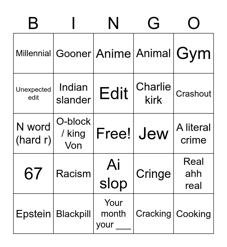 This bingo card has a free space and 24 words: Racism, Blackpill, Edit, Epstein, Gym, Millennial, Unexpected edit, Gooner, Jew, Ai slop, Charlie kirk, N word (hard r), Cringe, Real ahh real, Indian slander, Cracking, A literal crime, Anime, Crashout, O-block / king Von, Cooking, 67, Animal and Your month your ___.
