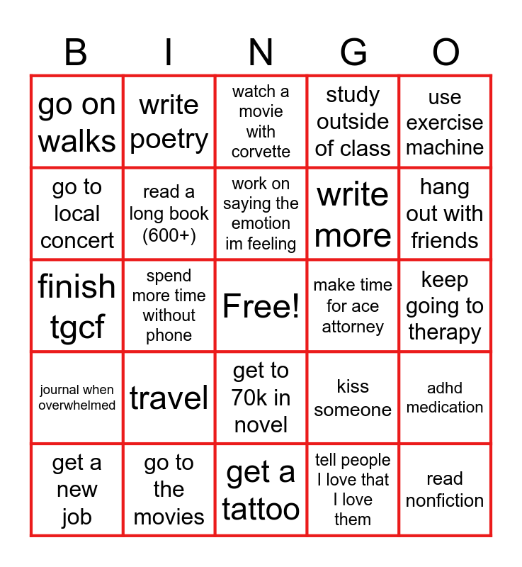 This bingo card has a free space and 24 words: get a new job, travel, work on saying the emotion im feeling, tell people I love that I love them, use exercise machine, go on walks, write poetry, watch a movie with corvette, make time for ace attorney, keep going to therapy, finish tgcf, read a long book (600+), kiss someone, adhd medication, go to local concert, go to the movies, get a tattoo, study outside of class, hang out with friends, journal when overwhelmed, spend more time without phone, get to 70k in novel, write more and read nonfiction.