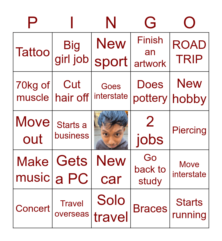 This bingo card has a free space and 24 words: Gets a PC, Travel overseas, Goes interstate, Concert, ROAD TRIP, Tattoo, 70kg of muscle, Big girl job, 2 jobs, New car, Does pottery, Move out, Go back to study, Move interstate, Cut hair off, Braces, Piercing, New sport, New hobby, Starts a business, Starts running, Make music, Finish an artwork and Solo travel.