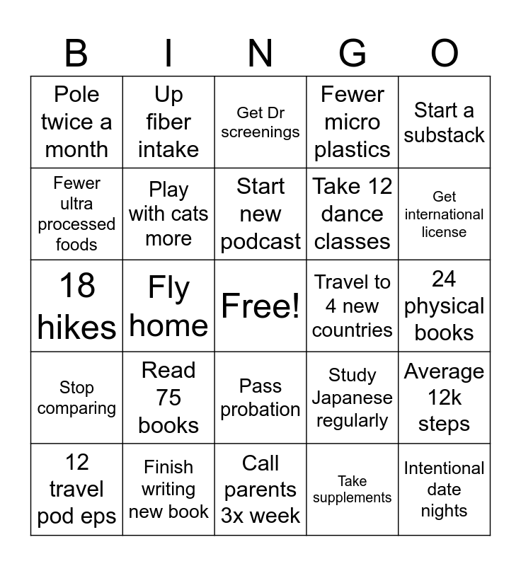This bingo card has a free space and 24 words: Read 75 books, Finish writing new book, Start new podcast, 12 travel pod eps, Start a substack, Pole twice a month, Fewer ultra processed foods, Up fiber intake, Travel to 4 new countries, Pass probation, Take 12 dance classes, 18 hikes, Study Japanese regularly, Average 12k steps, Play with cats more, Take supplements, 24 physical books, Get Dr screenings, Get international license, Fly home, Intentional date nights, Stop comparing, Fewer micro plastics and Call parents 3x week.