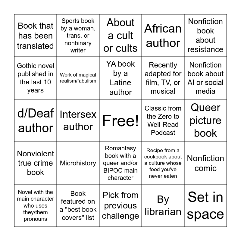 This bingo card has a free space and 24 words: Microhistory, Book featured on a "best book covers" list, YA book by a Latine author, Novel with the main character who uses they/them pronouns, Nonfiction book about resistance, Book that has been translated, Gothic novel published in the last 10 years, Sports book by a woman, trans, or nonbinary writer, Classic from the Zero to Well-Read Podcast, Romantasy book with a queer and/or BIPOC main character, Recently adapted for film, TV, or musical, d/Deaf author, Recipe from a cookbook about a culture whose food you've never eaten, Nonfiction comic, Work of magical realism/fabulism, By librarian, Queer picture book, About a cult or cults, Nonfiction book about AI or social media, Intersex author, Set in space, Nonviolent true crime book, African author and Pick from previous challenge.