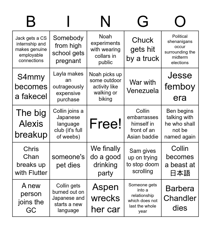 This bingo card has a free space and 24 words: someone's pet dies, Collin gets burned out on Japanese and starts a new language, Noah picks up some outdoor activity like walking or biking, A new person joins the GC, Political shenanigans occur surrounding the midterm elections, Jack gets a CS internship and makes genuine employable connections, S4mmy becomes a fakecel, Somebody from high school gets pregnant, Collin embarrasses himself in front of an Asian baddie, We finally do a good drinking party, War with Venezuela, The big Alexis breakup, Sam gives up on trying to stop doom scrolling, Collin becomes a beast at 日本語, Layla makes an outrageously expensive purchase, Someone gets into a relationship which does not last the whole year, Ben begins talking with he who shall not be named again, Noah experiments with wearing collars in public, Jesse femboy era, Collin joins a Japanese language club (it's full of weebs), Barbera Chandler dies, Chris Chan breaks up with Flutter, Chuck gets hit by a truck and Aspen wrecks her car.