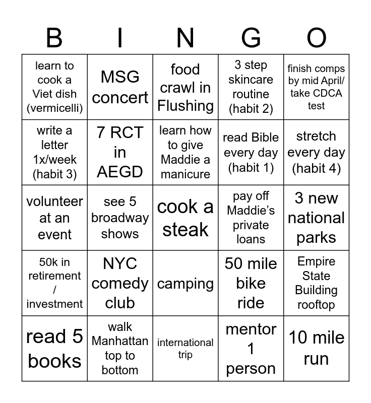 This bingo card has a free space and 24 words: NYC comedy club, walk Manhattan top to bottom, learn how to give Maddie a manicure, read 5 books, finish comps by mid April/ take CDCA test, learn to cook a Viet dish (vermicelli), write a letter 1x/week (habit 3), MSG concert, pay off Maddie’s private loans, camping, read Bible every day (habit 1), volunteer at an event, 50 mile bike ride, Empire State Building rooftop, 7 RCT in AEGD, mentor 1 person, 3 new national parks, food crawl in Flushing, stretch every day (habit 4), see 5 broadway shows, 10 mile run, 50k in retirement / investment, 3 step skincare routine (habit 2) and international trip.