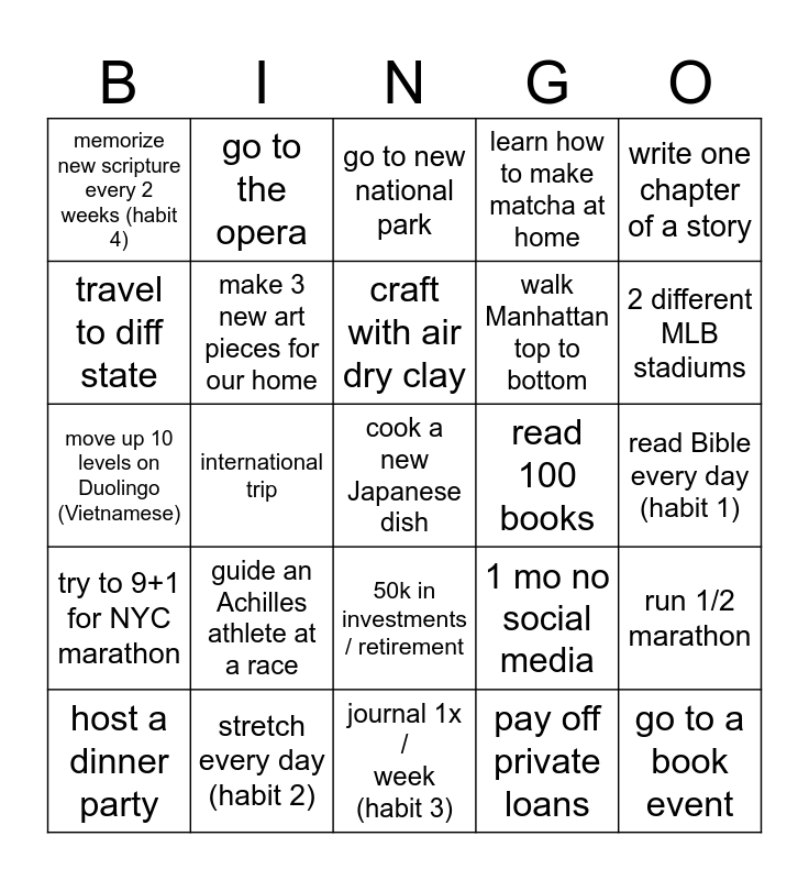 This bingo card has a free space and 24 words: guide an Achilles athlete at a race, stretch every day (habit 2), craft with air dry clay, host a dinner party, write one chapter of a story, memorize new scripture every 2 weeks (habit 4), travel to diff state, go to the opera, read 100 books, 50k in investments / retirement, walk Manhattan top to bottom, move up 10 levels on Duolingo (Vietnamese), 1 mo no social media, run 1/2 marathon, make 3 new art pieces for our home, pay off private loans, read Bible every day (habit 1), go to new national park, 2 different MLB stadiums, international trip, go to a book event, try to 9+1 for NYC marathon, learn how to make matcha at home and journal 1x / week (habit 3).
