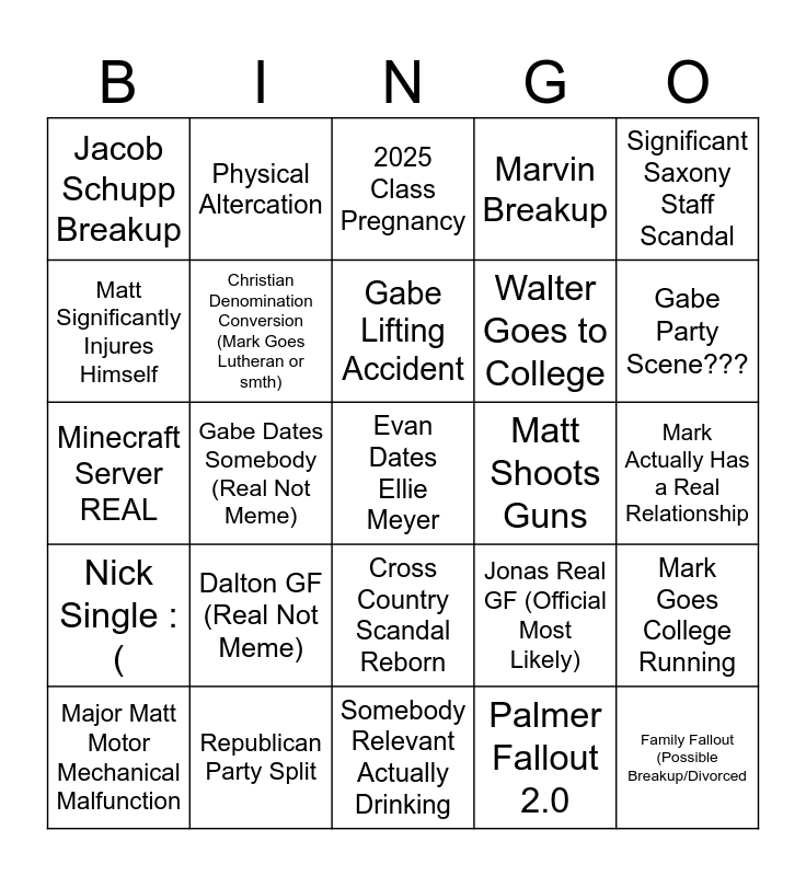 This bingo card has a free space and 24 words: Dalton GF (Real Not Meme), Republican Party Split, Gabe Lifting Accident, Major Matt Motor Mechanical Malfunction, Significant Saxony Staff Scandal, Jacob Schupp Breakup, Matt Significantly Injures Himself, Physical Altercation, Matt Shoots Guns, Cross Country Scandal Reborn, Walter Goes to College, Minecraft Server REAL, Jonas Real GF (Official Most Likely), Mark Goes College Running, Christian Denomination Conversion (Mark Goes Lutheran or smth), Palmer Fallout 2.0, Mark Actually Has a Real Relationship, 2025 Class Pregnancy, Gabe Party Scene???, Gabe Dates Somebody (Real Not Meme), Family Fallout (Possible Breakup/Divorced, Nick Single :(, Marvin Breakup and Somebody Relevant Actually Drinking.