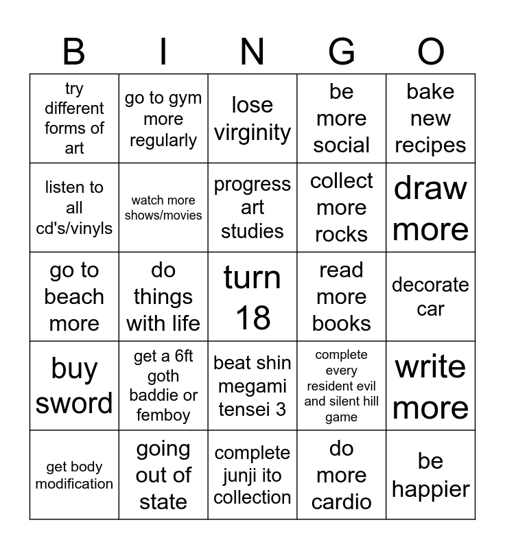 This bingo card has a free space and 24 words: get a 6ft goth baddie or femboy, going out of state, progress art studies, get body modification, bake new recipes, try different forms of art, listen to all cd's/vinyls, go to gym more regularly, read more books, beat shin megami tensei 3, collect more rocks, go to beach more, complete every resident evil and silent hill game, write more, watch more shows/movies, do more cardio, decorate car, lose virginity, draw more, do things with life, be happier, buy sword, be more social and complete junji ito collection.