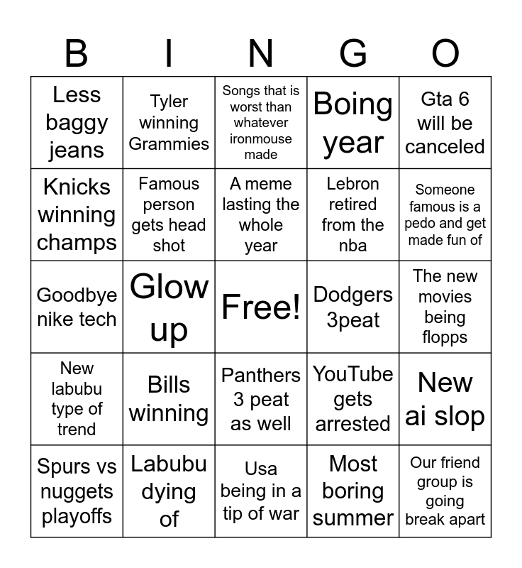 This bingo card has a free space and 24 words: Bills winning, Labubu dying of, A meme lasting the whole year, Spurs vs nuggets playoffs, Gta 6 will be canceled, Less baggy jeans, Knicks winning champs, Tyler winning Grammies, Dodgers 3peat, Panthers 3 peat as well, Lebron retired from the nba, Goodbye nike tech, YouTube gets arrested, New ai slop, Famous person gets head shot, Most boring summer, The new movies being flopps, Songs that is worst than whatever ironmouse made, Someone famous is a pedo and get made fun of, Glow up, Our friend group is going break apart, New labubu type of trend, Boing year and Usa being in a tip of war.