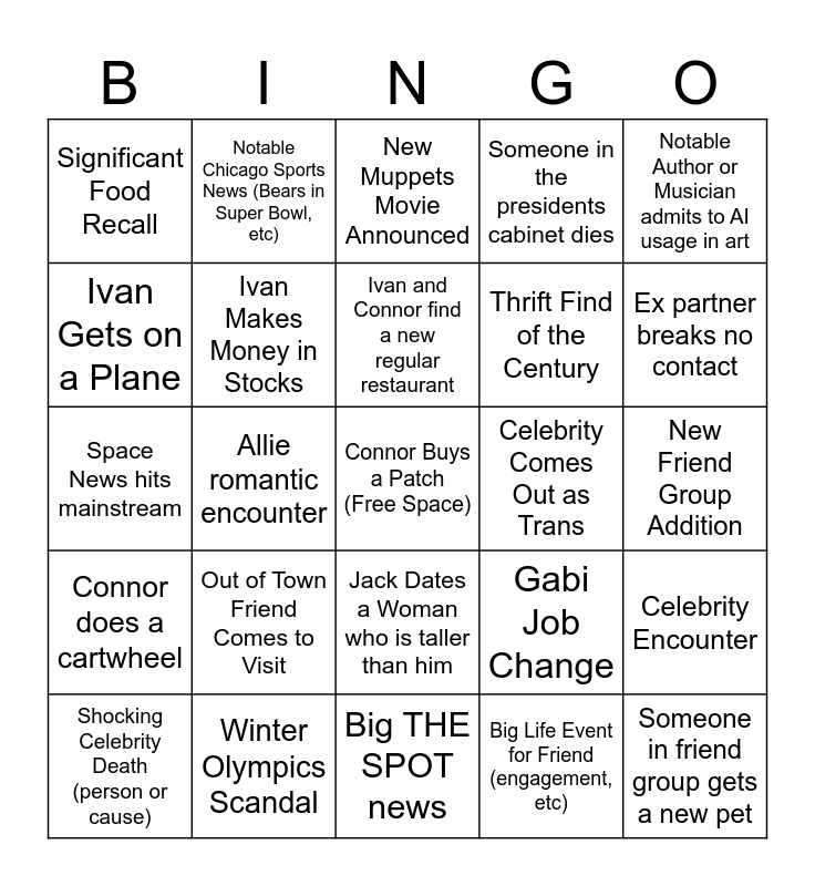 This bingo card has a free space and 24 words: Shocking Celebrity Death (person or cause), Out of Town Friend Comes to Visit, Ivan and Connor find a new regular restaurant, Big Life Event for Friend (engagement, etc), Notable Author or Musician admits to AI usage in art, Significant Food Recall, Notable Chicago Sports News (Bears in Super Bowl, etc), New Muppets Movie Announced, Celebrity Comes Out as Trans, New Friend Group Addition, Space News hits mainstream, Ivan Makes Money in Stocks, Gabi Job Change, Celebrity Encounter, Ivan Gets on a Plane, Winter Olympics Scandal, Big THE SPOT news, Someone in the presidents cabinet dies, Ex partner breaks no contact, Connor does a cartwheel, Allie romantic encounter, Jack Dates a Woman who is taller than him, Thrift Find of the Century and Someone in friend group gets a new pet.