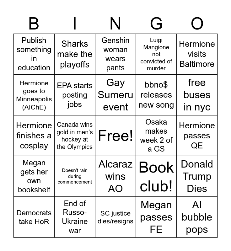 This bingo card has a free space and 24 words: Doesn't rain during commencement, End of Russo-Ukraine war, Gay Sumeru event, Democrats take HoR, Hermione visits Baltimore, Publish something in education, Hermione goes to Minneapolis (AIChE), Sharks make the playoffs, Osaka makes week 2 of a GS, Alcaraz wins AO, bbno$ releases new song, Hermione finishes a cosplay, Book club!, Donald Trump Dies, EPA starts posting jobs, Megan passes FE, Hermione passes QE, Genshin woman wears pants, free buses in nyc, Canada wins gold in men's hockey at the Olympics, AI bubble pops, Megan gets her own bookshelf, Luigi Mangione not convicted of murder and SC justice dies/resigns.