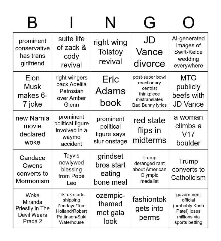 This bingo card has a free space and 54 words: Barron Trump comes out as anti-Israel, Candace Owens converts to Mormonism, Bishop Barron implies ICE should spare single Latinas, Peter Thiel publicly backs a sainthood campaign, grindset bros start eating bone meal, It happens, JD Vance divorce, autism registry, Elon Musk makes 6-7 joke, NHL player references Heated Rivalry, prominent conservative has trans girlfriend, Sydney Sweeney breast reduction discourse, TikTok starts shipping Zendaya/Tom Holland/Robert Pattinson/Suki Waterhouse, Woke Miranda Priestly in The Devil Wears Prada 2, Olivia Rodrigo / Sabrina Carpenter collab, ozempic-themed met gala look, government official (probably Kash Patel) loses millions via sports betting, post-super bowl reactionary centrist thinkpiece mistranslates Bad Bunny lyrics, Pope Leo at the Olympics, a woman climbs a V17 boulder, Trump deranged rant about American Olympic medalist, 1800s & vintage military-inspired fashion, red state flips in midterms, AI-generated images of Swift-Kelce wedding everywhere, lost work of ancient literature discovered, suite life of zack & cody revival, Chappell Roan mass cancellation, Zohran actually makes buses free, "The Drama"-inspired TikTok trend causes several real divorces, fashiontok gets into perms, conservative influencer defends Eteri Tutberidze, prunes are back in a big way, Gavin Newsom spotted having dinner with Katy Perry & Justin Trudeau, Jordan Peterson dies, right wing Tolstoy revival, Erika Kirk cabinet-level position, new Narnia movie declared woke, Trump converts to Catholicism, Rihanna and Charli XCX friendship, right wingers back Adeliia Petrosian over Amber Glenn, Elon vs. EU over Grok-generated images of underage olympic figure skaters, Janja Garnbret sends Bibliographie, Zendaya & Tom Holland announce wedding after it takes place, Swifties hallucinate a Swift-Kelce baby named Marjorie, Tayvis newlywed blessing from Pope Leo, Bishop Barron attends the Tayvis wedding, Great Schism healed, Nolan Odyssey hailed as antidote to "woke" Wilson translation, Eric Adams book, prominent political figure involved in a waymo accident, MTG publicly beefs with JD Vance, RFK Jr blames low fertility rates on baby formula, canonical throuple in a mainstream tv show and true crime podcast caught telling AI-generated stories.
