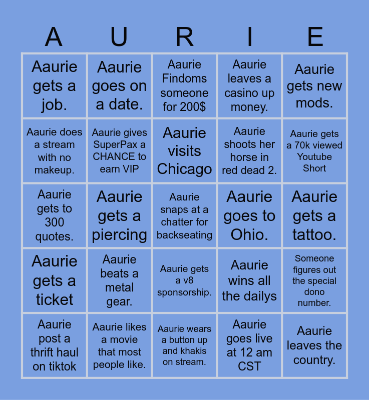 This bingo card has a free space and 24 words: Aaurie beats a metal gear., Aaurie likes a movie that most people like., Aaurie visits Chicago, Aaurie post a thrift haul on tiktok, Aaurie gets new mods., Aaurie gets a job., Aaurie does a stream with no makeup., Aaurie goes on a date., Aaurie goes to Ohio., Aaurie gets a v8 sponsorship., Aaurie shoots her horse in red dead 2., Aaurie gets to 300 quotes., Aaurie wins all the dailys, Someone figures out the special dono number., Aaurie gives SuperPax a CHANCE to earn VIP, Aaurie goes live at 12 am CST, Aaurie gets a tattoo., Aaurie Findoms someone for 200$, Aaurie gets a 70k viewed Youtube Short, Aaurie gets a piercing, Aaurie leaves the country., Aaurie gets a ticket, Aaurie leaves a casino up money. and Aaurie wears a button up and khakis on stream..