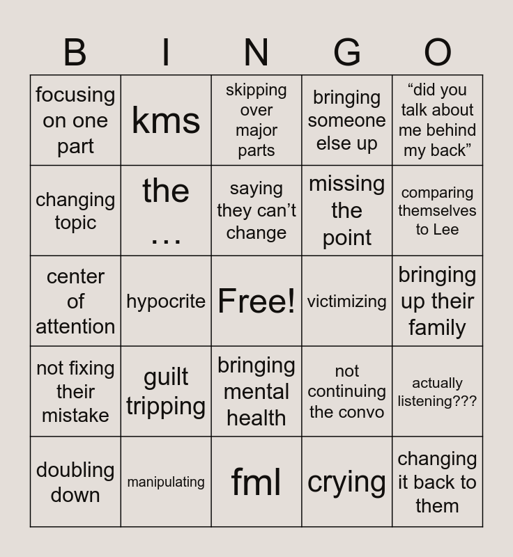 This bingo card has a free space and 24 words: guilt tripping, manipulating, saying they can’t change, doubling down, “did you talk about me behind my back”, focusing on one part, changing topic, kms, victimizing, bringing mental health, missing the point, center of attention, not continuing the convo, actually listening???, the …, crying, bringing up their family, skipping over major parts, comparing themselves to Lee, hypocrite, changing it back to them, not fixing their mistake, bringing someone else up and fml.