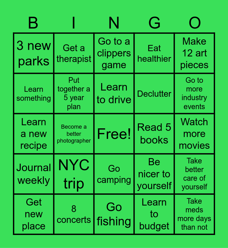This bingo card has a free space and 24 words: NYC trip, 8 concerts, Learn to drive, Get new place, Make 12 art pieces, 3 new parks, Learn something, Get a therapist, Read 5 books, Go camping, Declutter, Learn a new recipe, Be nicer to yourself, Take better care of yourself, Put together a 5 year plan, Learn to budget, Watch more movies, Go to a clippers game, Go to more industry events, Become a better photographer, Take meds more days than not, Journal weekly, Eat healthier and Go fishing.