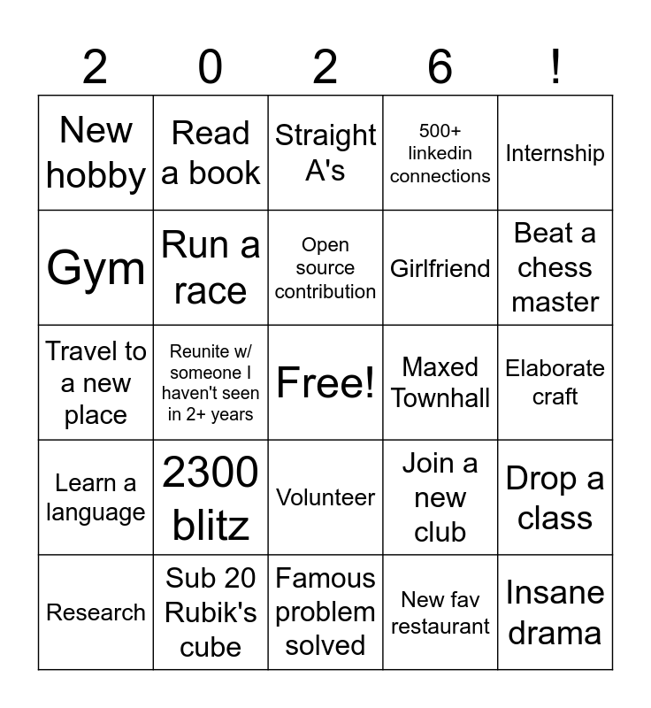 This bingo card has a free space and 24 words: 2300 blitz, Sub 20 Rubik's cube, Open source contribution, Research, Internship, New hobby, Gym, Read a book, Maxed Townhall, Volunteer, Girlfriend, Travel to a new place, Join a new club, Drop a class, Run a race, New fav restaurant, Elaborate craft, Straight A's, Beat a chess master, Reunite w/ someone I haven't seen in 2+ years, Insane drama, Learn a language, 500+ linkedin connections and Famous problem solved.