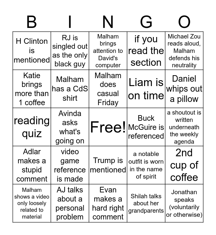 This bingo card has a free space and 28 words: 2nd cup of coffee, AJ shows up to class, Liam is on time, Shilah talks about her grandparents, Katie brings more than 1 coffee, Malham brings attention to David's computer, RJ is singled out as the only black guy, Adlar makes a stupid comment, Buck McGuire is referenced, Malham shows a video only loosely related to material, reading quiz, if you read the section, AJ talks about a personal problem, Evan makes a hard right comment, Daniel whips out a pillow, Star Wars reference is made, video game reference is made, Malham has a CdS shirt, Malham does casual Friday, Trump is mentioned, H Clinton is mentioned, someone complains about the amount of vocab, Jonathan speaks (voluntarily or otherwise), Avinda asks what's going on, a shoutout is written underneath the weekly agenda, a notable outfit is worn in the name of spirit, Michael Zou reads aloud, Malham defends his neutrality and Malham gives the class free time.
