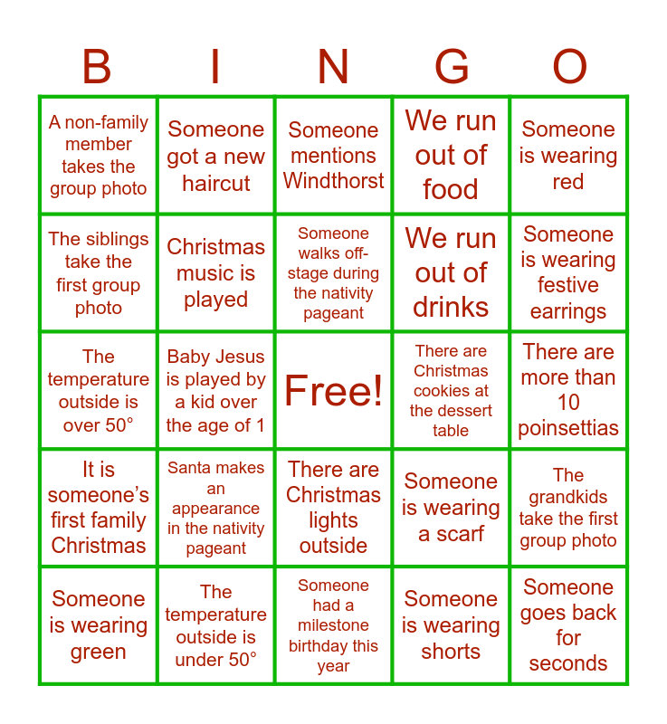 This bingo card has a free space and 33 words: Someone is wearing a Christmas sweater, Someone brings a dish that the siblings ate growing up, Baby Jesus is played by a kid over the age of 1, Someone brings boardgames, It is someone’s first family Christmas, Christmas music is played, Someone is wearing red, Someone is wearing green, Someone got a new haircut, Someone stands up during the 12 Days of Christmas, Someone walks off-stage during the nativity pageant, Someone mentions Windthorst, Someone spills their drink, An adult dresses up in the nativity pageant, There are Christmas cookies at the dessert table, Someone is wearing festive earrings, The temperature outside is under 50°, The temperature outside is over 50°, Santa makes an appearance in the nativity pageant, Someone is wearing a scarf, There are Christmas lights outside, Someone brings an family heirloom, A non-family member takes the group photo, There are more than 10 poinsettias, Someone had a milestone birthday this year, Someone goes back for seconds, We run out of food, We run out of drinks, The siblings take the first group photo, The grandkids take the first group photo, Someone’s missing from the family photo, Someone is wearing shorts and Someone brings one of their Christmas gifts.
