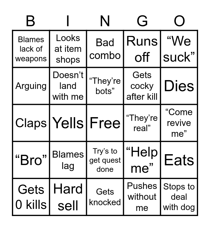 This bingo card has a free space and 24 words: Gets 0 kills, Blames lag, “They’re bots”, Pushes without me, “We suck”, Blames lack of weapons, Looks at item shops, Bad combo, “They’re real”, “Come revive me”, Claps, Doesn’t land with me, “Help me”, Eats, Arguing, Hard sell, Gets knocked, Runs off, Dies, “Bro”, Yells, Try’s to get quest done, Gets cocky after kill and Stops to deal with dog.