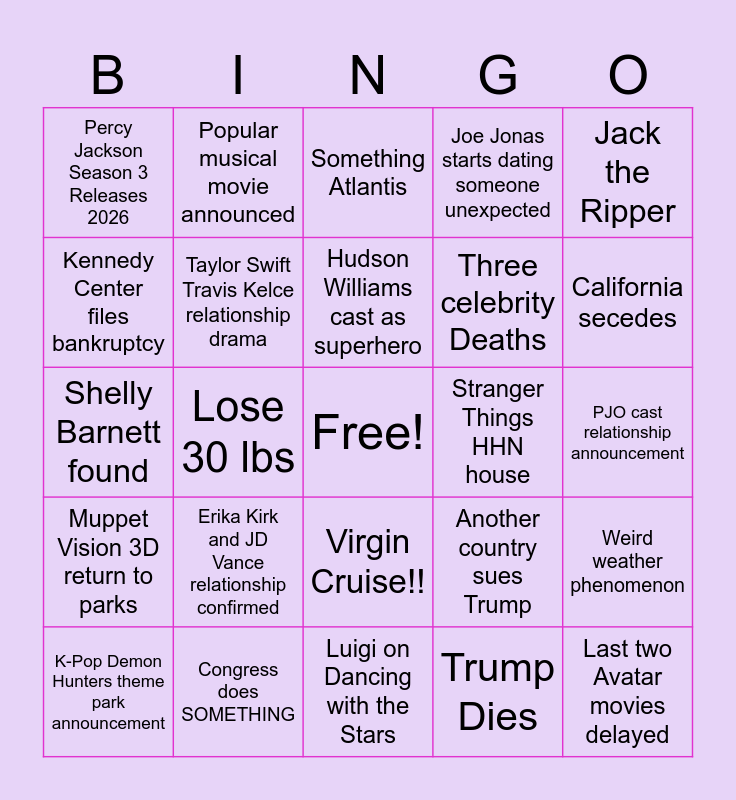 This bingo card has a free space and 24 words: Erika Kirk and JD Vance relationship confirmed, Congress does SOMETHING, Hudson Williams cast as superhero, K-Pop Demon Hunters theme park announcement, Jack the Ripper, Percy Jackson Season 3 Releases 2026, Kennedy Center files bankruptcy, Popular musical movie announced, Stranger Things HHN house, Virgin Cruise!!, Three celebrity Deaths, Shelly Barnett found, Another country sues Trump, Weird weather phenomenon, Taylor Swift Travis Kelce relationship drama, Trump Dies, PJO cast relationship announcement, Something Atlantis, California secedes, Lose 30 lbs, Last two Avatar movies delayed, Muppet Vision 3D return to parks, Joe Jonas starts dating someone unexpected and Luigi on Dancing with the Stars.