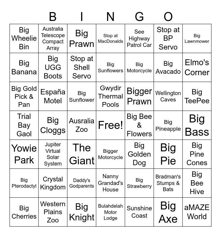 This bingo card has a free space and 48 words: Big Strawberry, Big Avacado, Bulahdelah Motor Lodge, Big Cloggs, Big Sunflower, Big Bass, Australia Telescope Compact Array, Western Plains Zoo, Stop at BP Servo, Bigger Motorcycle, Big Lawnmower, Stop at MacDonalds, Wellington Caves, Bigger Prawn, Big Pterodactyl, Big Pineapple, Big Banana, Elmo's Corner, Bradman's Stumps & Bats, See Highway Patrol Car, Big Motorcycle, Ausralia Zoo, Big Wheelie Bin, Big UGG Boots, Big Bee Hive, Stop at Shell Servo, Big TeePee, Big Cherries, Gwydir Thermal Pools, España Motel, Big Axe, Big Bee & Flowers, Big Pine Cones, Crystal Kingdom, Trial Bay Gaol, Big Golden Dog, Big Pie, Big Gold Pick & Pan, The Giant, Daddy's Godparents, Yowie Park, aMAZE World, Big Prawn, Big Knight, Big Sunflowers, Nanny Grandad's House, Jupiter Virtual Solar System and Sunshine Coast.