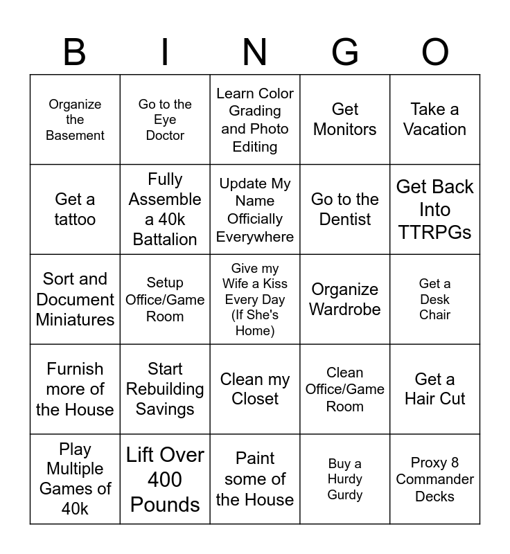 This bingo card has a free space and 24 words: Start Rebuilding Savings, Lift Over 400 Pounds, Update My Name Officially Everywhere, Play Multiple Games of 40k, Take a Vacation, Organize the Basement, Get a tattoo, Go to the Eye Doctor, Organize Wardrobe, Clean my Closet, Go to the Dentist, Sort and Document Miniatures, Clean Office/Game Room, Get a Hair Cut, Fully Assemble a 40k Battalion, Buy a Hurdy Gurdy, Get a Desk Chair, Learn Color Grading and Photo Editing, Get Back Into TTRPGs, Setup Office/Game Room, Proxy 8 Commander Decks, Furnish more of the House, Get Monitors and Paint some of the House.