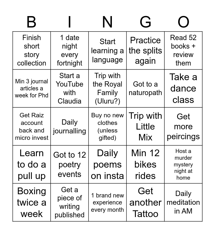 This bingo card has a free space and 24 words: Got to 12 poetry events, Get a piece of writing published, Trip with the Royal Family (Uluru?), Boxing twice a week, Read 52 books + review them, Finish short story collection, Min 3 journal articles a week for Phd, 1 date night every fortnight, Trip with Little Mix, Daily poems on insta, Got to a naturopath, Get Raiz account back and micro invest, Min 12 bikes rides, Host a murder mystery night at home, Start a YouTube with Claudia, Get another Tattoo, Get more peircings, Start learning a language, Take a dance class, Daily journalling, Daily meditation in AM, Learn to do a pull up, Practice the splits again and 1 brand new experience every month.