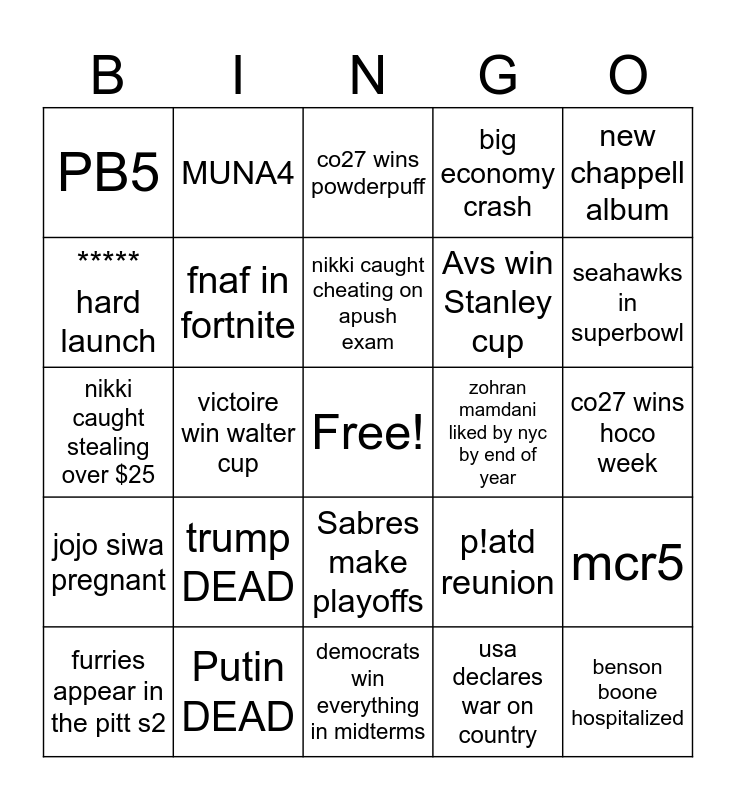 This bingo card has a free space and 24 words: trump DEAD, Putin DEAD, nikki caught cheating on apush exam, furries appear in the pitt s2, new chappell album, PB5, ***** hard launch, MUNA4, zohran mamdani liked by nyc by end of year, Sabres make playoffs, Avs win Stanley cup, nikki caught stealing over $25, p!atd reunion, mcr5, fnaf in fortnite, usa declares war on country, co27 wins hoco week, co27 wins powderpuff, seahawks in superbowl, victoire win walter cup, benson boone hospitalized, jojo siwa pregnant, big economy crash and democrats win everything in midterms.
