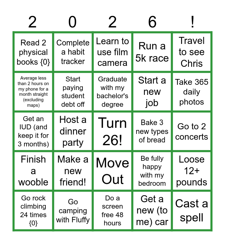 This bingo card has a free space and 24 words: Make a new friend!, Go camping with Fluffy, Graduate with my bachelor's degree, Go rock climbing 24 times {0}, Travel to see Chris, Read 2 physical books {0}, Average less than 2 hours on my phone for a month straight (excluding maps), Complete a habit tracker, Bake 3 new types of bread, Move Out, Start a new job, Get an IUD (and keep it for 3 months), Be fully happy with my bedroom, Loose 12+ pounds, Start paying student debt off, Get a new (to me) car, Go to 2 concerts, Learn to use film camera, Take 365 daily photos, Host a dinner party, Cast a spell, Finish a wooble, Run a 5k race and Do a screen free 48 hours.