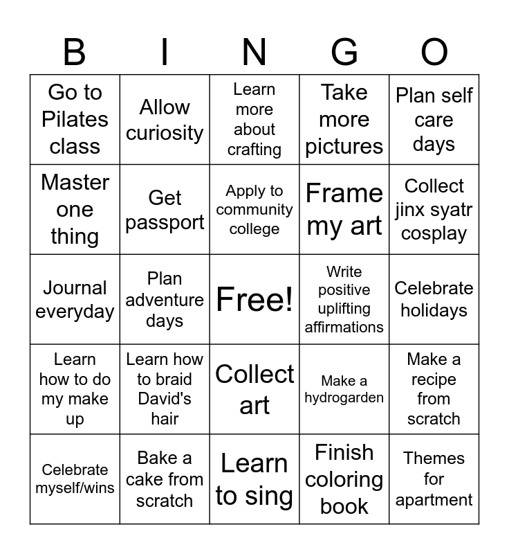 This bingo card has a free space and 24 words: Learn how to braid David's hair, Bake a cake from scratch, Apply to community college, Celebrate myself/wins, Plan self care days, Go to Pilates class, Master one thing, Allow curiosity, Write positive uplifting affirmations, Collect art, Frame my art, Journal everyday, Make a hydrogarden, Make a recipe from scratch, Get passport, Finish coloring book, Celebrate holidays, Learn more about crafting, Collect jinx syatr cosplay, Plan adventure days, Themes for apartment, Learn how to do my make up, Take more pictures and Learn to sing.