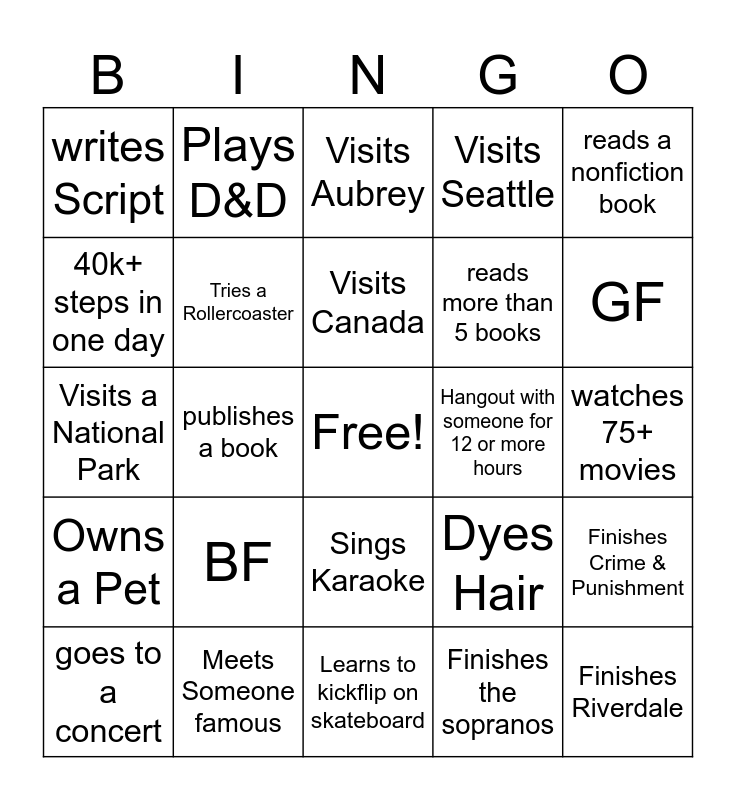 This bingo card has a free space and 24 words: BF, Meets Someone famous, Visits Canada, goes to a concert, reads a nonfiction book, writes Script, 40k+ steps in one day, Plays D&D, Hangout with someone for 12 or more hours, Sings Karaoke, reads more than 5 books, Visits a National Park, Dyes Hair, Finishes Crime & Punishment, Tries a Rollercoaster, Finishes the sopranos, watches 75+ movies, Visits Aubrey, GF, publishes a book, Finishes Riverdale, Owns a Pet, Visits Seattle and Learns to kickflip on skateboard.