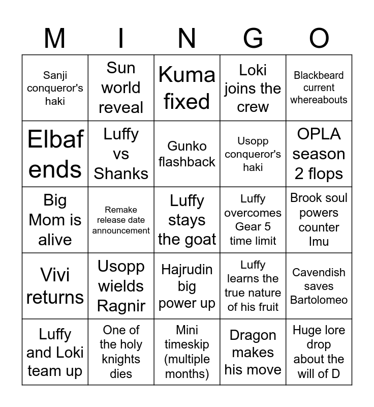 This bingo card has a free space and 24 words: Usopp wields Ragnir, One of the holy knights dies, Gunko flashback, Luffy and Loki team up, Blackbeard current whereabouts, Sanji conqueror's haki, Elbaf ends, Sun world reveal, Luffy overcomes Gear 5 time limit, Hajrudin big power up, Usopp conqueror's haki, Big Mom is alive, Luffy learns the true nature of his fruit, Cavendish saves Bartolomeo, Luffy vs Shanks, Dragon makes his move, Brook soul powers counter Imu, Kuma fixed, OPLA season 2 flops, Remake release date announcement, Huge lore drop about the will of D, Vivi returns, Loki joins the crew and Mini timeskip (multiple months).
