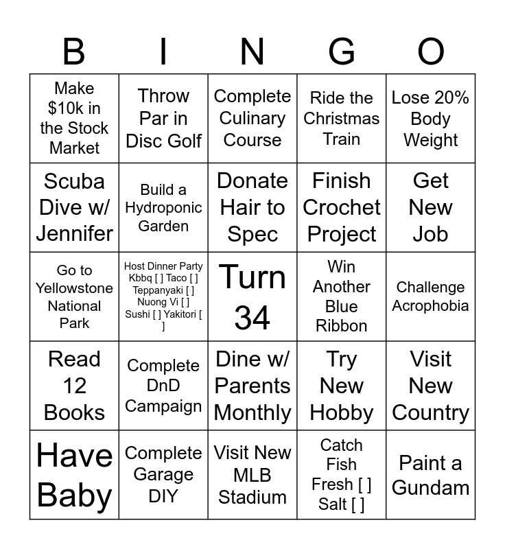 This bingo card has a free space and 24 words: Complete DnD Campaign, Complete Garage DIY, Donate Hair to Spec, Have Baby, Lose 20% Body Weight, Make $10k in the Stock Market, Scuba Dive w/ Jennifer, Throw Par in Disc Golf, Win Another Blue Ribbon, Dine w/ Parents Monthly, Finish Crochet Project, Go to Yellowstone National Park, Try New Hobby, Visit New Country, Build a Hydroponic Garden, Catch Fish Fresh [ ] Salt [ ], Challenge Acrophobia, Complete Culinary Course, Get New Job, Host Dinner Party Kbbq [ ] Taco [ ] Teppanyaki [ ] Nuong Vi [ ] Sushi [ ] Yakitori [ ], Paint a Gundam, Read 12 Books, Ride the Christmas Train and Visit New MLB Stadium.