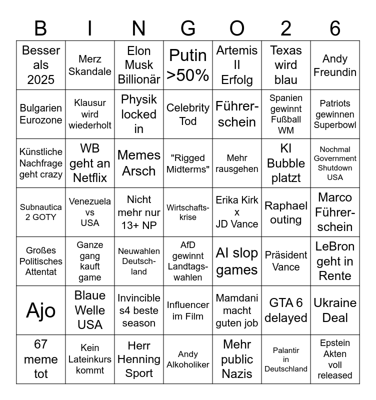This bingo card has 49 words: GTA 6 delayed, Spanien gewinnt Fußball WM, Mehr public Nazis, Venezuela vs USA, Memes Arsch, Marco Führer-schein, Merz Skandale, Herr Henning Sport, Texas wird blau, AfD gewinnt Landtags- wahlen, Andy Freundin, Putin >50%, KI Bubble platzt, Mehr rausgehen, Blaue Welle USA, Raphael outing, Bulgarien Eurozone, Patriots gewinnen Superbowl, Ukraine Deal, Artemis II Erfolg, Führer-schein, Nicht mehr nur 13+ NP, Besser als 2025, Klausur wird wiederholt, 67 meme tot, Physik locked in, Nochmal Government Shutdown USA, Kein Lateinkurs kommt, "Rigged Midterms", WB geht an Netflix, Epstein Akten voll released, Erika Kirk x JD Vance, Ajo, Invincible s4 beste season, Subnautica 2 GOTY, AI slop games, Präsident Vance, LeBron geht in Rente, Künstliche Nachfrage geht crazy, Neuwahlen Deutsch- land, Influencer im Film, Großes Politisches Attentat, Wirtschafts-krise, Andy Alkoholiker, Celebrity Tod, Elon Musk Billionär, Mamdani macht guten job, Ganze gang kauft game and Palantir in Deutschland.