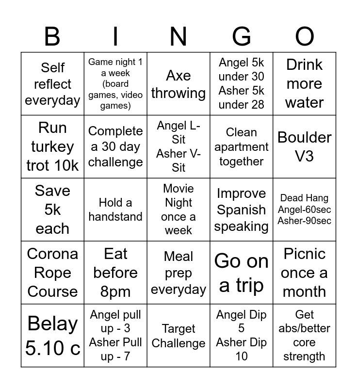 This bingo card has a free space and 24 words: Eat before 8pm, Angel pull up - 3 Asher Pull up - 7, Angel L-Sit Asher V-Sit, Belay 5.10 c, Drink more water, Self reflect everyday, Run turkey trot 10k, Game night 1 a week (board games, video games), Improve Spanish speaking, Meal prep everyday, Clean apartment together, Save 5k each, Go on a trip, Picnic once a month, Complete a 30 day challenge, Angel Dip 5 Asher Dip 10, Dead Hang Angel-60sec Asher-90sec, Axe throwing, Boulder V3, Hold a handstand, Get abs/better core strength, Corona Rope Course, Angel 5k under 30 Asher 5k under 28 and Target Challenge.