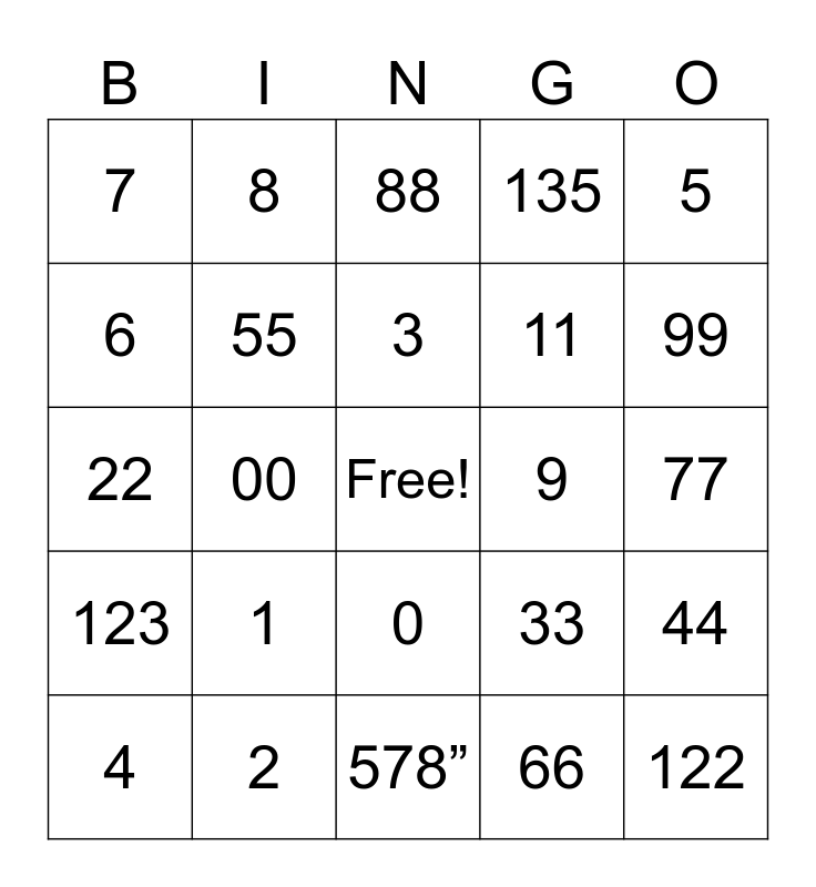 This bingo card has a free space and 24 words: 1, 2, 3, 4, 5, 7, 6, 8, 9, 0, 11, 22, 33, 44, 55, 66, 77, 88, 99, 00, 122, 123, 135 and 578”.