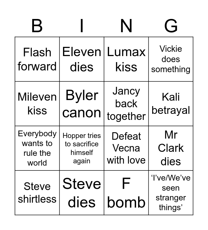 This bingo card has 16 words: Steve dies, Mr Clark dies, Lumax kiss, Flash forward, Everybody wants to rule the world, Eleven dies, Defeat Vecna with love, F bomb, Mileven kiss, Byler canon, Steve shirtless, Vickie does something, Hopper tries to sacrifice himself again, Kali betrayal, Jancy back together and ‘I’ve/We’ve seen stranger things’.